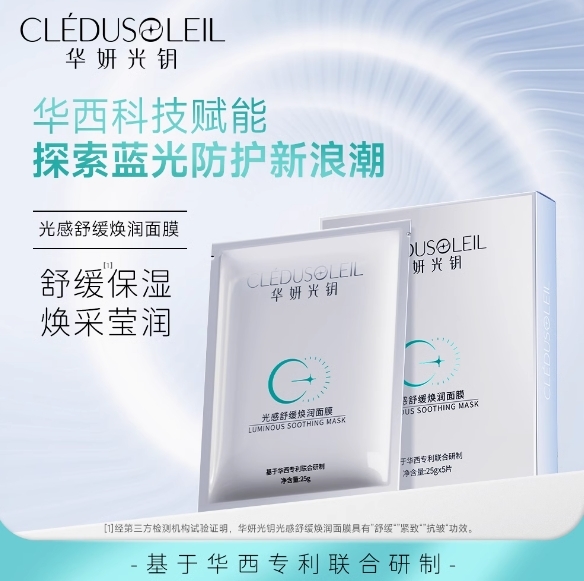 华妍光钥成功转化的蓝光防护专利技术如“光盾”一般,防护人造光损。华妍光钥光感系列,专注皮肤光防护,有面霜、眼霜、次抛精华、面膜等产品。其中,光感舒缓焕润面膜,添加依克多因,源自沙漠盐湖,协同抗光老。水解透明质酸钠与精氨酸,两种成分补水保湿,马齿苋提取物则可舒护光损泛红。